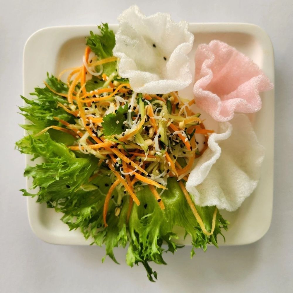 Салат айсберг, морковь, кинза, фунчоза, креветочные чипсы, кунжутная заправка