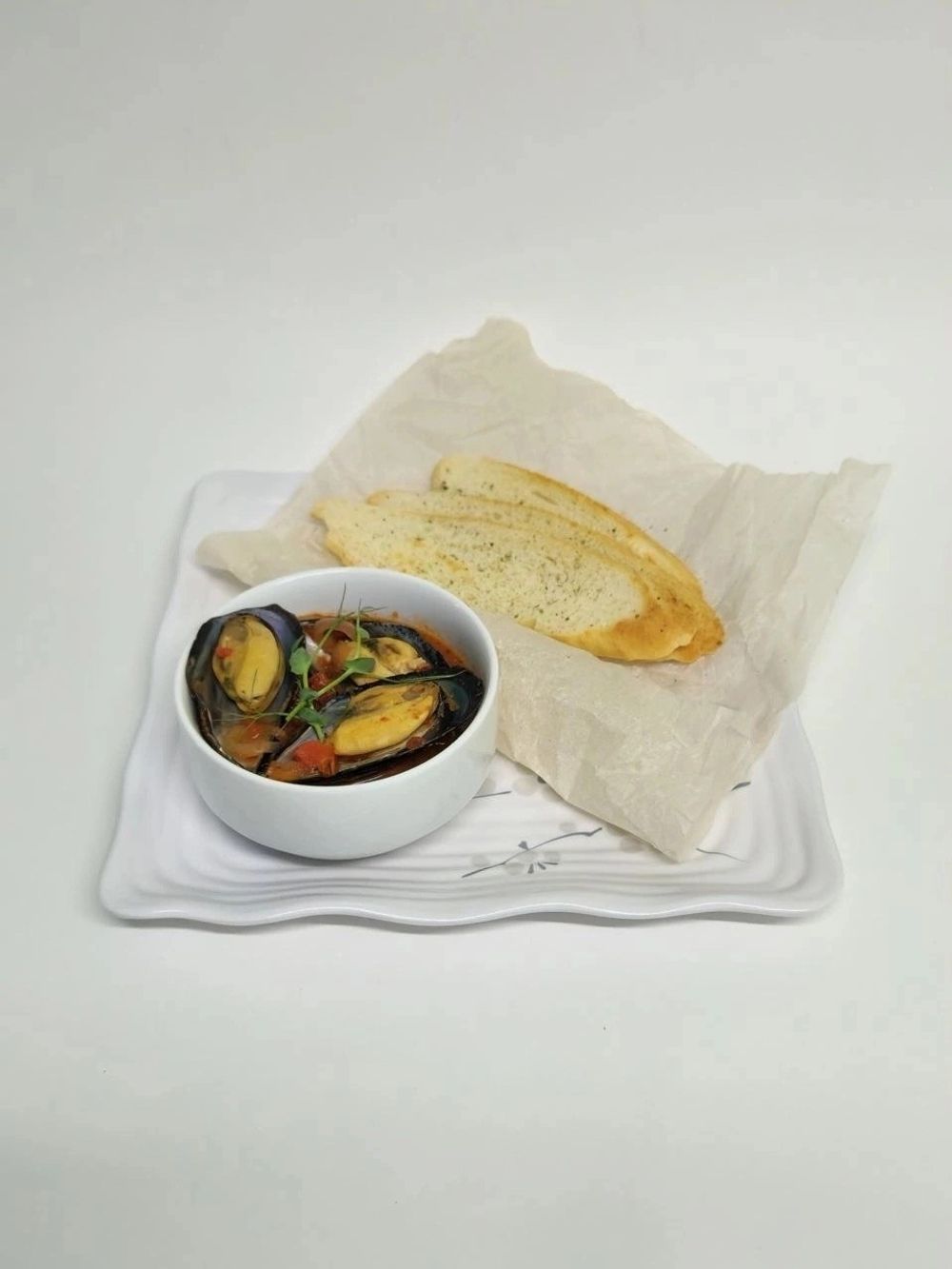 Мидии с соусом на выбор, сливочный или томатный, подается с обжаренной чиабаттой