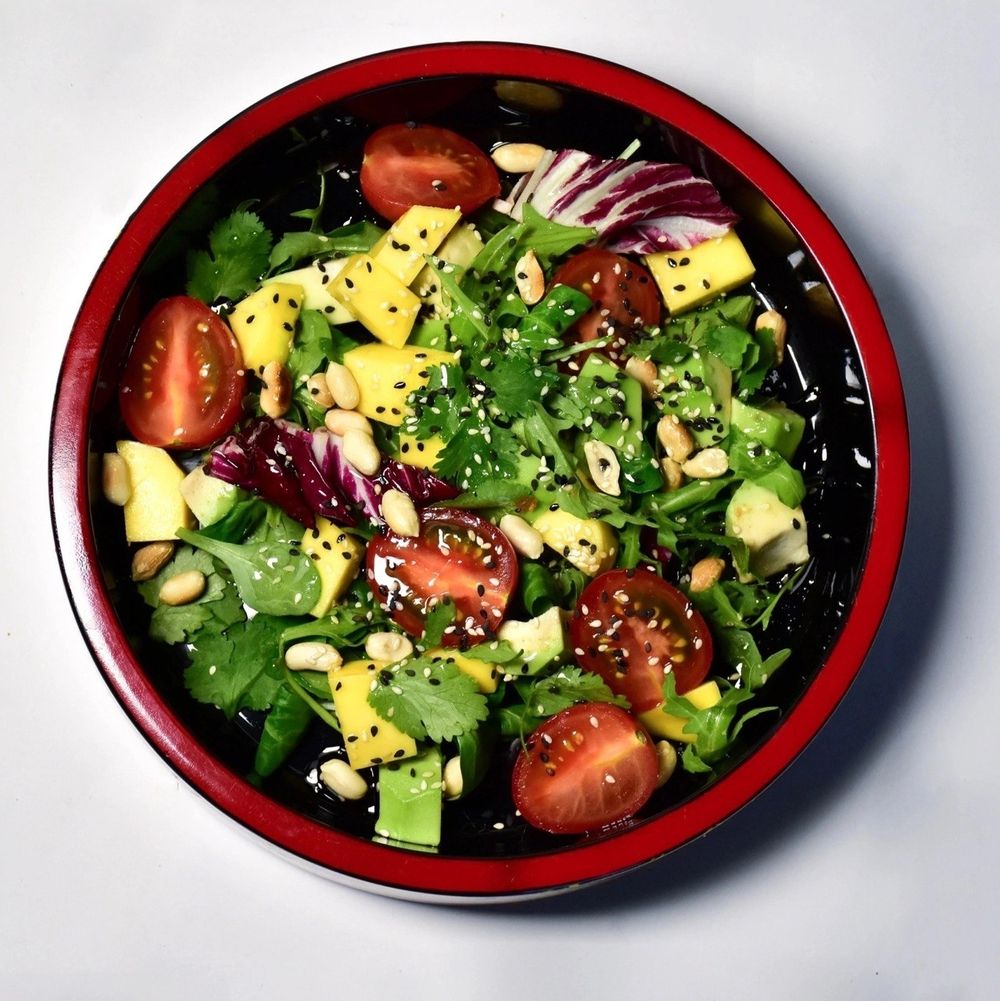 Помидоры черри, авокадо, манго, зелень, арахис, кунжутная заправка, зелень, салат микс, микрозелень