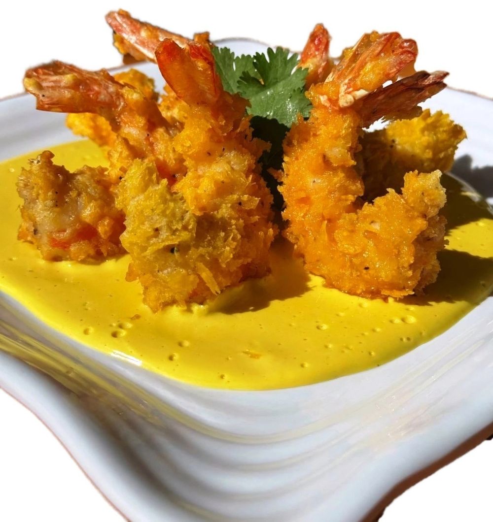 Креветки, тесто темпура, сливки пюре манго