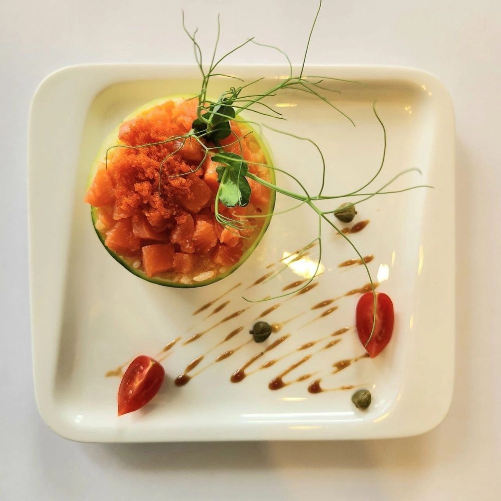 Рис, лосось, свежий огурец, икра масаго, каперсы, помидор черри, соус динамит