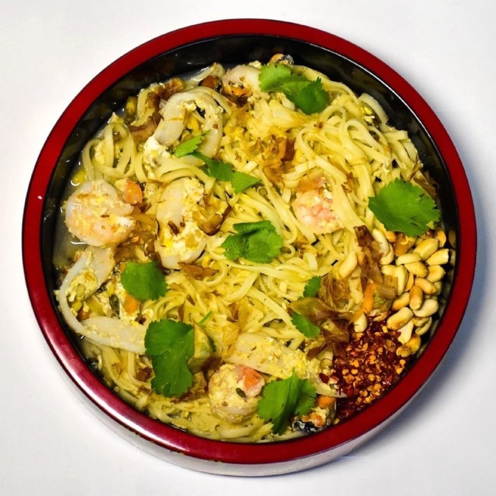 Лапша или рис (на выбор), масло кунжутное микс, мидии очищенные, креветки тигровые, кальмар филе, лук, сахар, ростки бобовые, бульон мясной, соус рыбный, стружка тунца, арахис, специи, кинза
